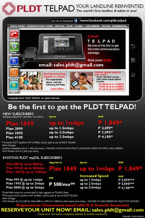 If you already have a myDSL + Landline at your home you can just add PHP500 to your monthly bill and you can get one of this. You can still get this even you are not a subscriber yet. Just subscribe to PLDT and apply for a reservation for the PLDT Telpad