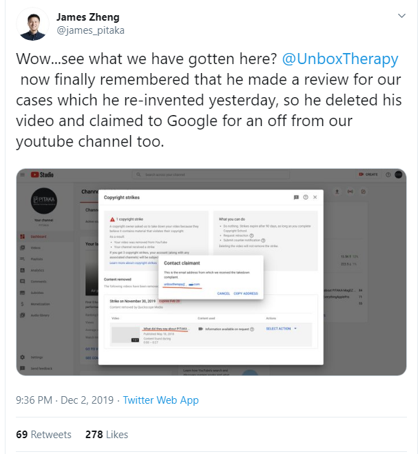 Pitaka is a small phone case company compared to Unbox Therapy’s popularity and income. Pitaka’s presence in the market was undoubtedly boosted by Unbox Therapy’s unboxing video of the Pitaka case as the video gained over 4.4 million views. Days before the Later case release, the Pitaka unboxing video was removed. But that’s not all, Pitaka CEO, James Zheng, posted a screenshot of a copyright takedown claim. The screenshot evidently shows the claimant is Unbox Therapy.